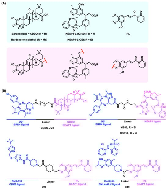 (A) Chemical structures of the KEAP1 E3 ligase ligands. Red wavy lines indicate the typical attachment points for linker conjugation in PROTAC design. (B) Chemical structures of the KEAP1-based PROTAC degraders.