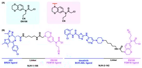 Fem-1 homolog B (FEM1B), a substrate-recognition component of the CUL2 E3 ubiquitin protein ligase, plays a pivotal role in cellular reductive stress response by recognizing the reduced cysteine residue C186 on its substrate FNIP1, thereby mediating FNIP1 ubiquitination and degradation to restore mitochondrial activity and redox balance [78,79,80]. This unique mechanism positions FEM1B as a potential therapeutic target. In 2022, the Nomura group reported the discovery of EN106, the first covalent ligand targeting FEM1B [81]. EN106 forms a covalent bond with C186 of FEM1B, disrupting FEM1B-FNIP1 recognition and inhibiting FNIP1 degradation. Experimental results demonstrated that EN106 effectively stabilizes FNIP1 and exhibits high target specificity and degradation efficiency in cells. Building on this discovery, the researchers conjugated EN106 with the BET bromodomain inhibitor JQ1 to develop FEM1B-based BET degraders [81]. Among these, NJH-1-106 achieved the most potent degradation of BRD4, with a DC50 of 250 nM and a Dmax of 94%. Additionally, the FEM1B-based kinase degrader NJH-2-142 successfully targeted the oncogenic BCR-ABL fusion protein, demonstrating the versatility of FEM1B as a recruiter in PROTAC applications (Figure 11).