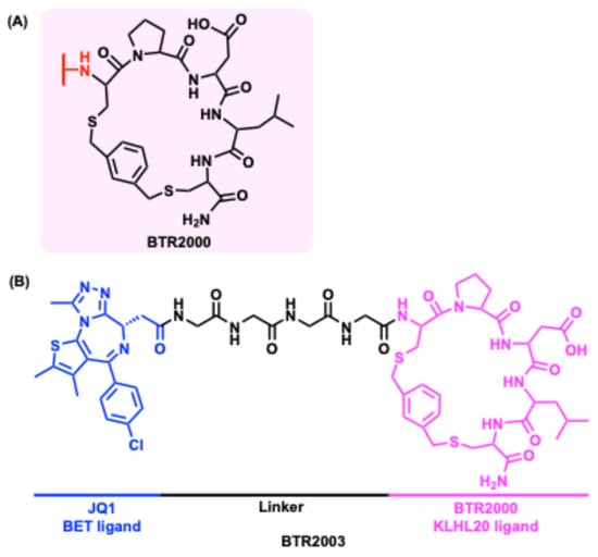 In 2022, the Yeh group designed a synthetic macrocyclic ligand BTR2000 for KLHL20, a substrate adaptor of the CUL3 E3 ligase complex, and validated KLHL20 as an effective E3 ligase for PROTAC applications [82]. Through structure-guided design (PDB ID: 6GY5), the authors developed a bifunctional degrader BTR2003 that recruits KLHL20 to BET family proteins (Figure 12), achieving potent, dose-dependent degradation in cellular models via the ubiquitin-proteasome pathway, as confirmed by mechanistic studies involving ligase inhibitors and knockdown experiments. This macrocyclic PROTAC demonstrated improved efficiency over linear counterparts, highlighting the role of conformational constraints in enhancing ternary complex formation.