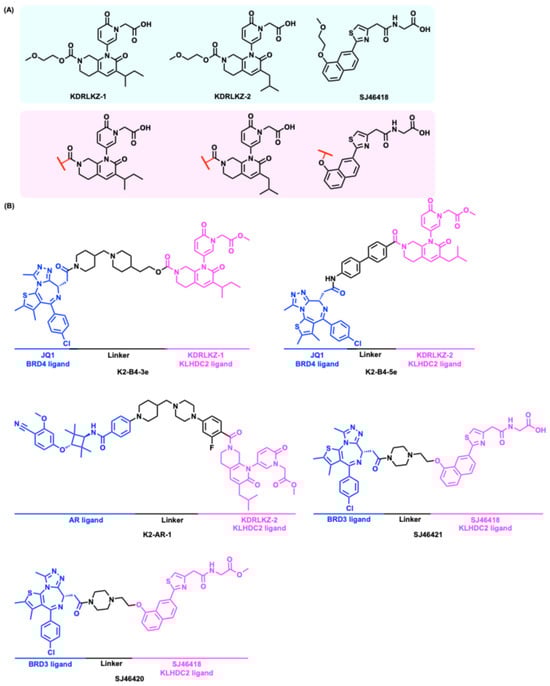 (A) Chemical structures of the KLHDC2 E3 ligase ligand. Red wavy lines indicate the typical attachment points for linker conjugation in PROTAC design. (B) Chemical structures of the KLHDC2-based PROTAC degraders.