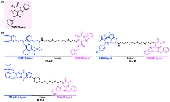 In 2024, the Zhang group first identified FBXO22 as a novel recruitable ligase through a CRISPR-based transcriptional activation screen of human E3 ligases [85]. Using a heterobifunctional PROTAC, 22-SLF, which links an FKBP12-binding ligand to an electrophilic warhead, they demonstrated FBXO22-dependent degradation of FKBP12, mediated by covalent interactions with cysteines C227 and/or C228 in FBXO22, as confirmed by mechanistic studies. Further, FBXO22-based PROTACs effectively degraded additional endogenous proteins, including BRD4 (22-JQ1) and the oncogenic fusion protein EML4-ALK (22-TAE), in cellular models (Figure 14). This work validates FBXO22 as a versatile E3 ligase for PROTAC design, offering a new avenue to diversify the limited pool of ligases.