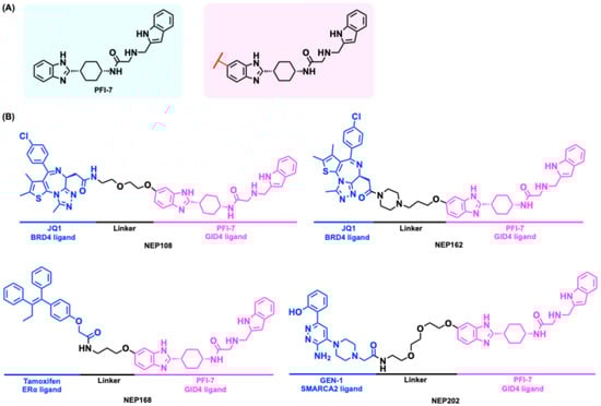 (A) Chemical structures of the GID4 E3 ligase ligand. Red wavy lines indicate the typical attachment points for linker conjugation in PROTAC design. (B) Chemical structures of the GID4-based PROTAC degraders.