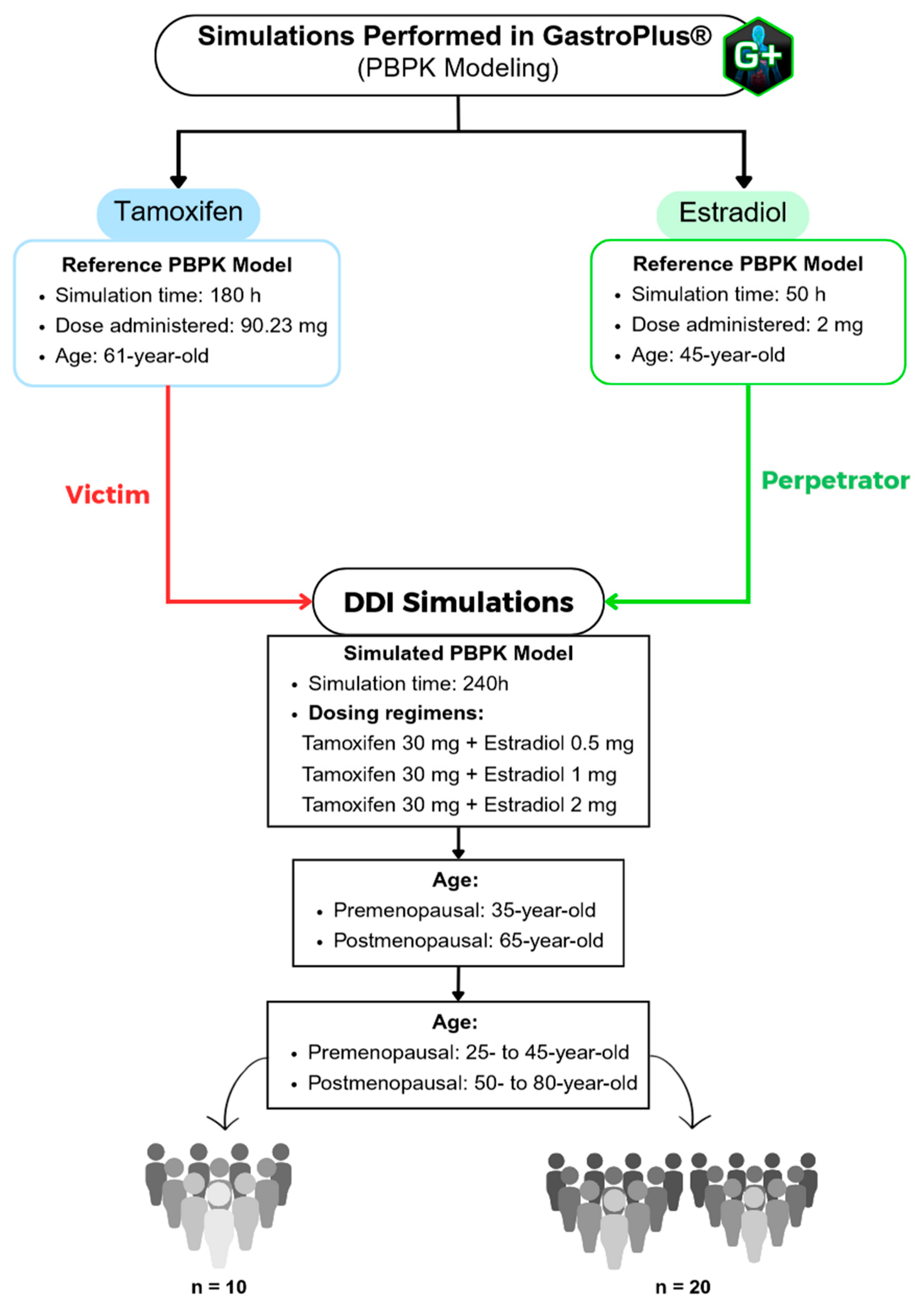 To further evaluate the pharmacokinetic interaction between tamoxifen and estradiol, a population simulation was carried out using the «Population Simulation» module of GastroPlus®, with the «DDI» mode activated. This approach makes it possible to incorporate inter-individual variability and observe the behavior of the drugs in a simulated population. Population simulations (n = 10 and n = 20) were conducted in the GastroPlus® Population Simulation module to sample inter-individual variability across the predefined age groups; these simulations do not emulate a clinical trial. DDI was assessed in dynamic and stationary modes with estradiol as perpetrator and tamoxifen as victim, using AUC and C_max ratios (with/without perpetrator) for interaction classification.