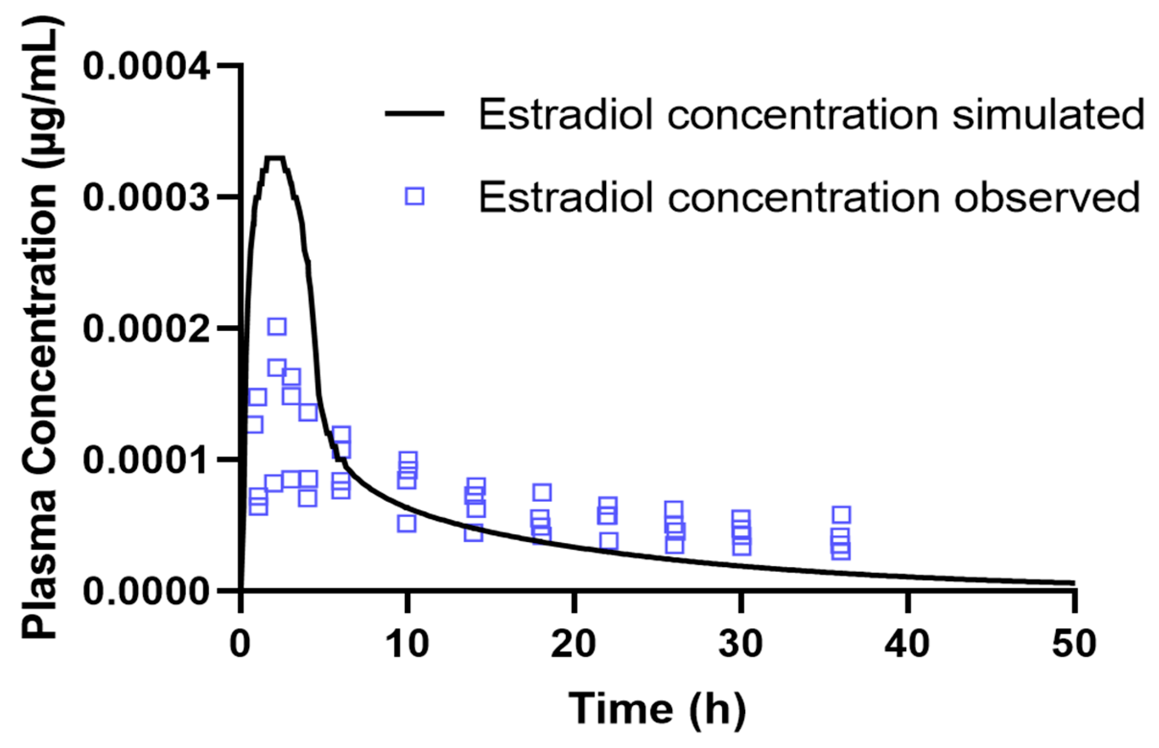 Table 6 shows the comparison between the experimental pharmacokinetic parameters described in the study by Sier et al. and the values estimated by the PBPK model after a 50-h simulation. The results obtained show an acceptable agreement between the simulated data and the observed values, reflecting the validity of the model to represent the pharmacokinetic behavior of estradiol after oral administration.
