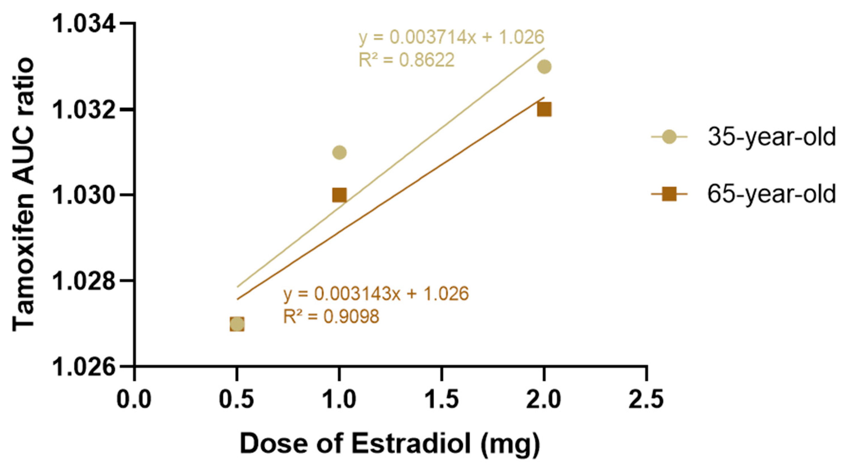 Figure 4 illustrates this relationship, showing that although there is a linear correlation between increasing the dose of estradiol and the AUC ratio of tamoxifen, the impact is minimal. Linear regression analysis confirmed that the increase in tamoxifen exposure was minimal and did not warrant significant clinical concerns.
