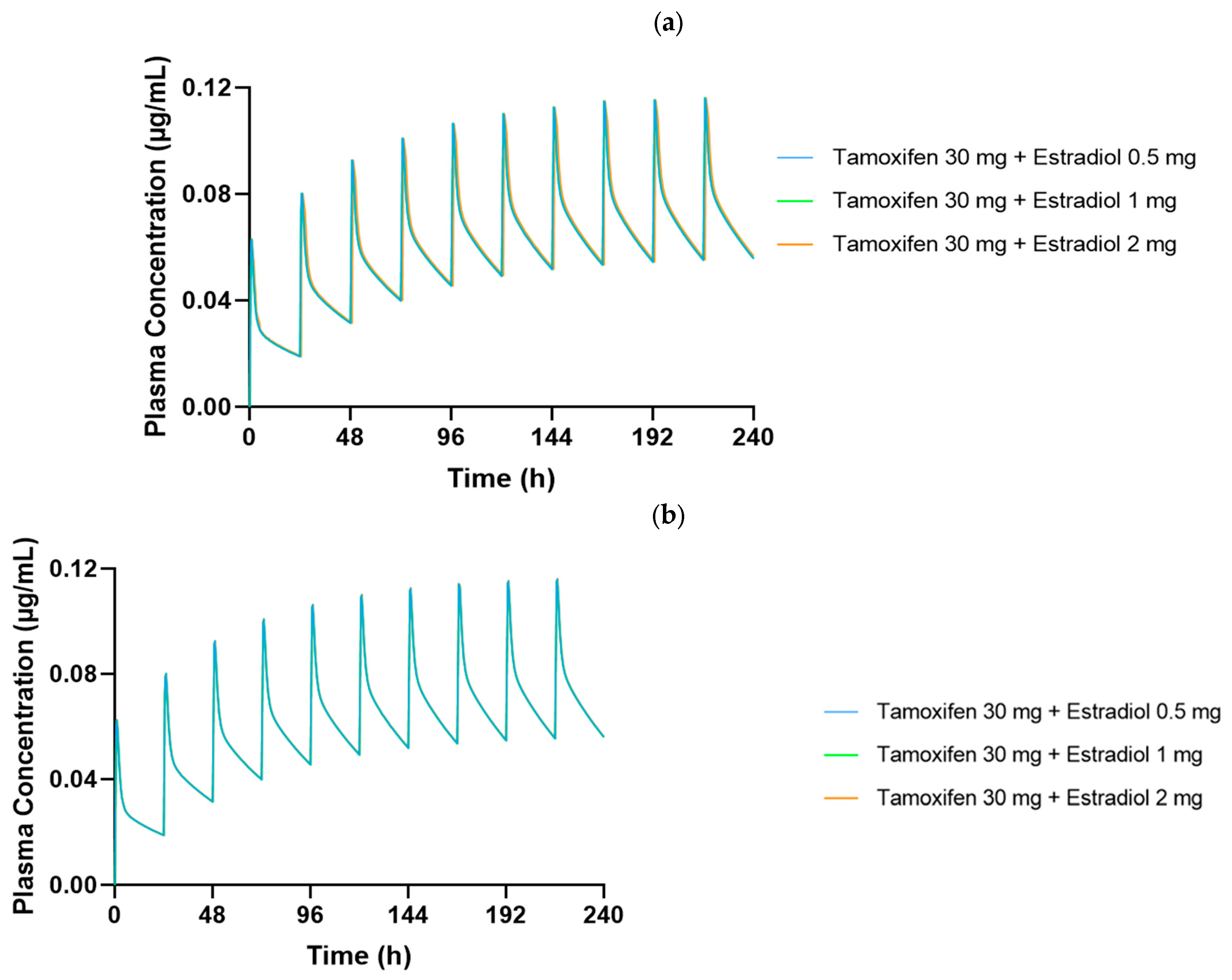 To complement the quantitative data, Figure 5 shows the plasma concentration profiles of tamoxifen over time for both ages. The curves obtained show an almost total overlap between the different doses of estradiol, which visually confirms the absence of a relevant pharmacokinetic impact. These results support the hypothesis that estradiol, at the doses simulated, is not a relevant clinical perpetrator of interactions with tamoxifen, and that coadministration is safe from a pharmacokinetic point of view.