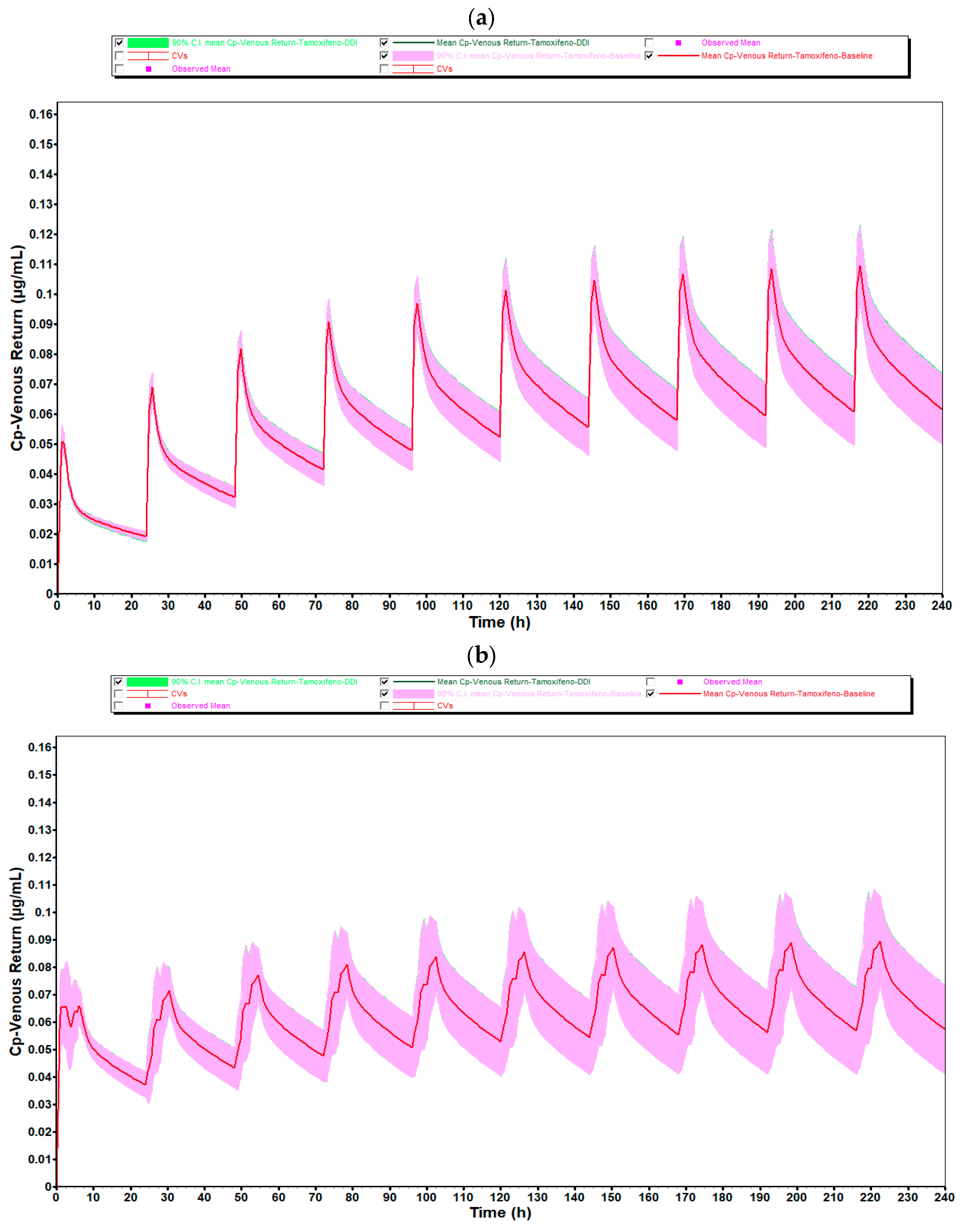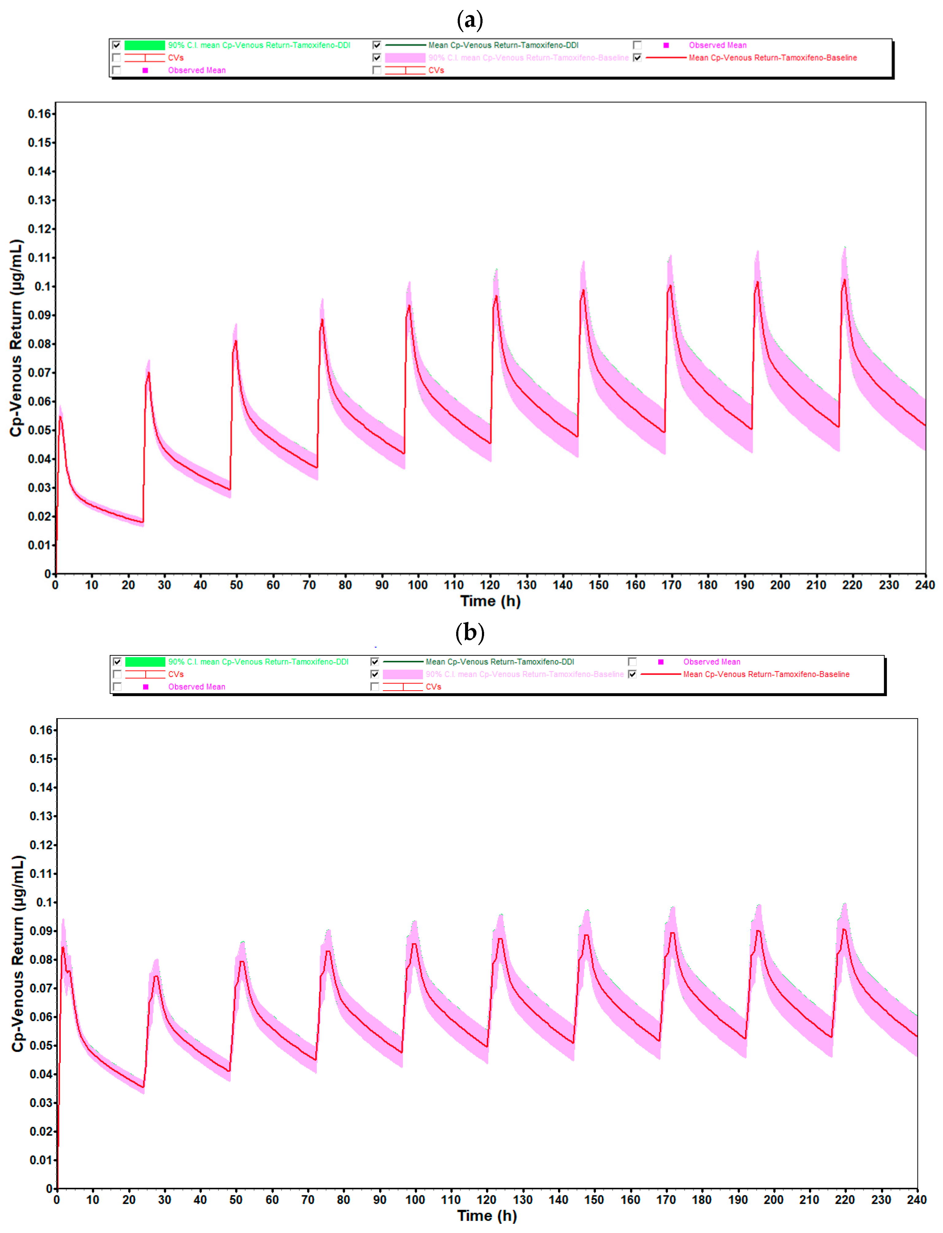 Initially, representative hormonal profiles were simulated: a premenopausal woman (30-year-old) and a postmenopausal woman (65-year-old), both over 240 h. Three estradiol dosage regimens were tested (0.5 mg, 1 mg and 2 mg/day), administered together with a single dose of tamoxifen (30 mg). In stationary mode, the magnitude of the interaction was assessed based on the AUC ratio (with and without the perpetrator), according to the standard classification (none, weak, moderate or strong).