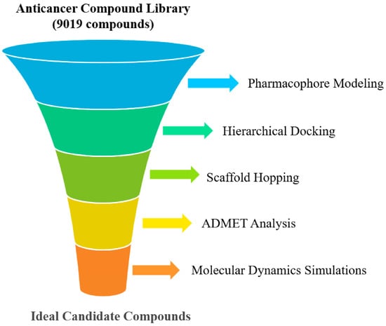 In developing targeted therapies for FGFR1-dependent pathologies, the conventional drug discovery paradigm confronts critical limitations [17]. Computer-aided drug design (CADD) has revolutionized modern drug discovery by integrating multidisciplinary strategies with advanced computational methodologies [18,19,20]. We implemented an integrated computational workflow combining ligand-based pharmacophore modeling, molecular docking, ADMET profiling, scaffold-hopping, and molecular dynamics simulations [21]. The computational workflow developed herein demonstrates enhanced efficiency over conventional discovery pipelines [22]. This approach enables high-throughput screening of compound libraries for rapid lead candidate identification, accelerating the discovery-to-preclinical development pipeline [23]. By enabling predictive computational assessment of compound properties, this strategy mitigates unnecessary synthetic and experimental efforts, thereby optimizing resource allocation [24]. Moreover, this methodology demonstrates superior success rates in drug discovery. Through systematic analysis of drug-target interactions, it guides structural refinements to simultaneously enhance binding affinity/selectivity while reducing toxicity profiles [24].