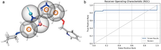 Characterization and Validation of the ADRRR_2 Pharmacophore Hypothesis. (a) Three-dimensional (3D) structure of the ADRRR_2 pharmacophore hypothesis in complex with its reference ligand; (b) receiver operating characteristic (ROC) curve validation of the ADRRR_2 model.