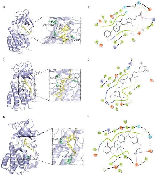 Compound 18149 (Figure 4a,b) engages FGFR1 through hydrogen bonds with Glu562, Ala564, and Gly485, complemented by a salt bridge with Lys482 and π–π stacking with Phe489. Compound 21769 (Figure 4c,d) establishes hydrogen bonding interactions with Glu562, Ala564, and Asp641. Compound 20357 (Figure 4e,f) demonstrates the most extensive binding network, forming dual salt bridges with Glu571 and Glu486, establishing hydrogen bonds with Glu571 and Ala564, and displaying π–π stacking with Phe489.