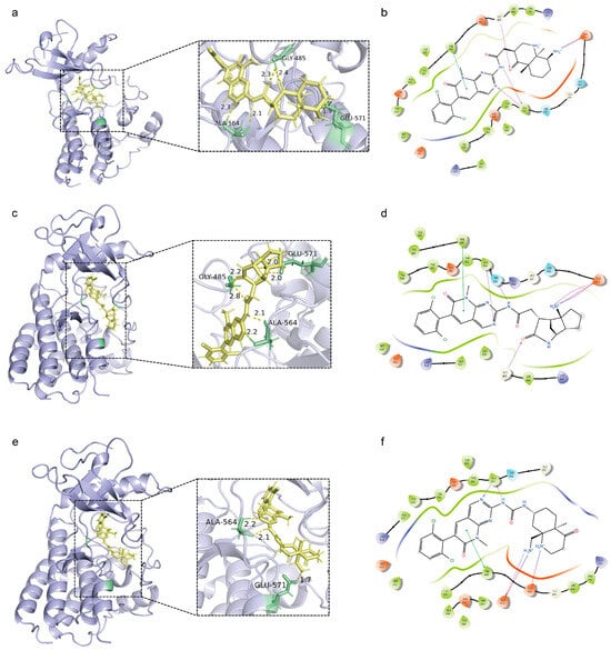 Interactions in protein–ligand complexes following scaffold hopping: (a) 3D binding mode of Compound 20357a; (b) 2D binding mode of Compound 20357a; (c) 3D binding mode of Compound 20357b; (d) 2D binding mode of Compound 20357b; (e) 3D binding mode of Compound 20357c; (f) 2D binding mode of Compound 20357c.