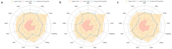The ADMETlab2.0 radar plot of candidate compounds. (a) Compound 20357a; (b) Compound 20357b; (c) Compound 20357c.