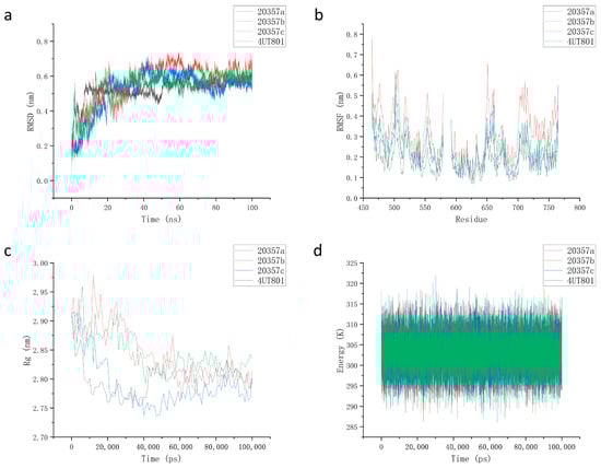 During the preliminary phase of drug research and development, leveraging computer simulation techniques to predict and assess the ADMET properties of candidate drugs enables the timely elimination of potentially problematic compounds [42,43]. This not only substantially augments the overall R&D efficiency but also curtails the associated costs. In the current study, the ADMETlab2.0 online platform (https://ADMETmesh.scbdd.com/service/screening/index, accessed on 5 March 2025) was employed. This platform was used to conduct ADMET projections for the compounds where the following scaffold hopping was employed. This platform was used to conduct ADMET projections for the compounds following scaffold hopping. Subsequently, three small molecules, namely Compound 20357a, Compound 20357b, and Compound 20357c, which exhibited superior characteristic indices compared to the positive reference 4UT801 across all relevant aspects, were meticulously selected for subsequent molecular dynamics simulation investigations.