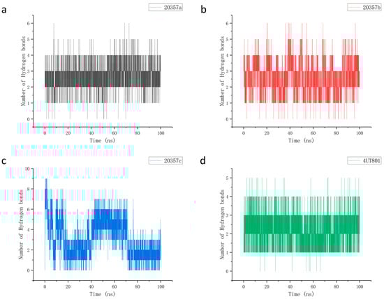 Number of protein–ligand hydrogen bonds over time during molecular dynamics simulations. (a) Compound 20357a; (b) Compound 20357b; (c) Compound 20357c; (d) 4UY801.