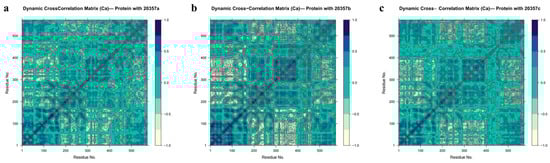 Notably, distinct diagonal lines are evident in all plots, signifying strong positive autocorrelations for each residue. Block structures in the plots correspond to the protein’s secondary structural elements (e.g., α-helices or β-sheets), where residues display collective motions. More pronounced block structures in Figure 9b,c indicate robust residue correlations in these molecules, whereas Figure 9a shows a more diffuse pattern, potentially reflecting independent dynamic behavior of residues in this molecule.