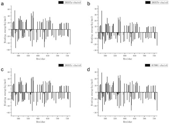 The radius of gyration (Rg) of proteins reflects the structural compactness of proteins. As shown in Figure 7c, the average Rg values of the proteins and compounds were below 2.97 nm, indicating that the four ligand-protein complexes maintained structural compactness during the simulation. Among them, the protein Rg values of Compound 20357a and Compound 20357c were overall lower than those of the positive control compounds, suggesting more compact protein structures in these two ligand-protein systems.