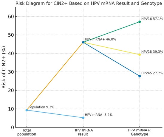 Figure 2. Risk of CIN2+ in the co-testing cohort according to overall HPV mRNA status and genotype among HPV mRNA-positive women. The diagram shows the risk in the total screening population (9.3%), then stratified by HPV mRNA status alone (46.0% for HPV mRNA-positive vs. 5.2% for HPV mRNA-negative women), and further by genotype among HPV mRNA-positive women: 57.1% for HPV16, 39.3% for HPV18, and 27.7% for HPV45. Abbreviations: CIN2+, cervical intraepithelial neoplasia grade 2 or worse; HPV, human papillomavirus; mRNA, messenger RNA.