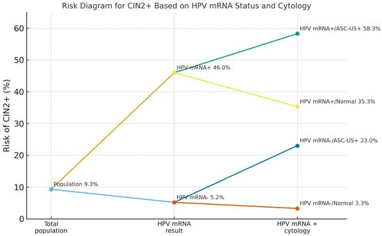 Figure 3. Risk of CIN2+ in the co-testing cohort according to HPV mRNA status and cytology. The diagram shows the overall risk in the total screening population (9.3%), then stratified by HPV mRNA status alone (46.0% for HPV mRNA-positive vs. 5.2% for HPV mRNA-negative women), and further by cytology grade. Among HPV mRNA-positive women, CIN2+ risk was 58.3% with ASC-US+ cytology and 35.3% with normal cytology. Among HPV mRNA-negative women, the corresponding risks were 23.0% and 3.3%, respectively. Abbreviations: CIN2+, cervical intraepithelial neoplasia grade 2 or worse; HPV, human papillomavirus; mRNA, messenger RNA; ASC-US+, ASC-US or more severe cytological abnormalities according to the Bethesda classification (ASC-US, LSIL, ASC-H, HSIL, AIS, cytological cervical cancer).