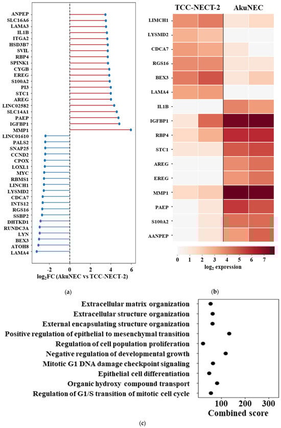 A bidirectional ranked plot demonstrated extensive baseline transcriptional reprogramming in AkuNEC cells relative to TCC-NECT-2, with both upregulated and downregulated gene sets clearly evident (Figure 2a). Genes exhibiting increased expression in AkuNEC included multiple inflammatory, secretory, and metabolic regulators, whereas genes reduced in AkuNEC were enriched for factors associated with cellular structure, differentiation, and homeostatic regulation.