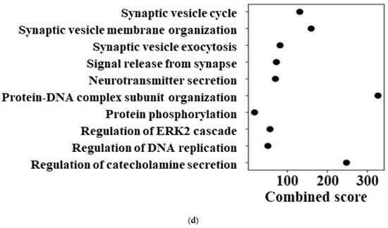 We next examined the functional implications of these baseline transcriptional differences using pathway enrichment analysis. Gene ontology (GO) biological process enrichment was performed separately for genes upregulated and downregulated in AkuNEC based on baseline log2FC rankings. Gene lists used for enrichment analyses are provided in Supplementary Table S5 (upregulated) and Table S6 (downregulated). Pathways enriched among upregulated genes (Figure 2c) were predominantly associated with extracellular matrix organization, epithelial–mesenchymal transition, regulation of cell population proliferation, inflammatory signaling, and stress-related processes. In contrast, pathways enriched among downregulated genes (Figure 2d) were associated with synaptic vesicle organization, neurotransmitter secretion, protein–DNA complex organization, regulation of ERK1/2 signaling, and DNA replication-related processes. The same combined score scale was applied to both panels to allow direct comparison of functional enrichment patterns.