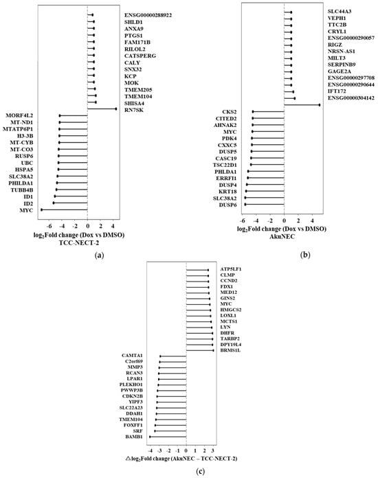 To directly compare drug-induced responses between the two cell lines, we calculated the differential doxorubicin response (Δresponse), defined as the difference in log2 fold-change between AkuNEC and TCC-NECT-2 (Figure 3c). This analysis revealed a set of genes that were preferentially induced in AkuNEC under doxorubicin stress, including CCND2, GINS2, MYC, HMGCS2, FDX1, DHFR, and BRMS1L. These genes are involved in cell cycle regulation, DNA replication, metabolic reprogramming, and mitochondrial function, suggesting enhanced transcriptional plasticity in AkuNEC cells. Conversely, genes exhibiting relatively attenuated responses in AkuNEC included BAMBI, CDKN2B, FOXF1, SRF, and other regulators associated with differentiation and growth suppression. Genes ranked by Δresponse are provided in Supplementary Table S9.