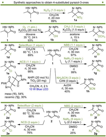 - Sheng, X.; Zhang, J.; Yang, H.; Jiang, G. Tunable Aerobic Oxidative Hydroxylation/Dehydrogenative Homocoupling of Pyrazol-5-Ones under Transition-Metal-Free Conditions. Org. Lett. 2017, 19, 2618–2621. [Google Scholar] [CrossRef]