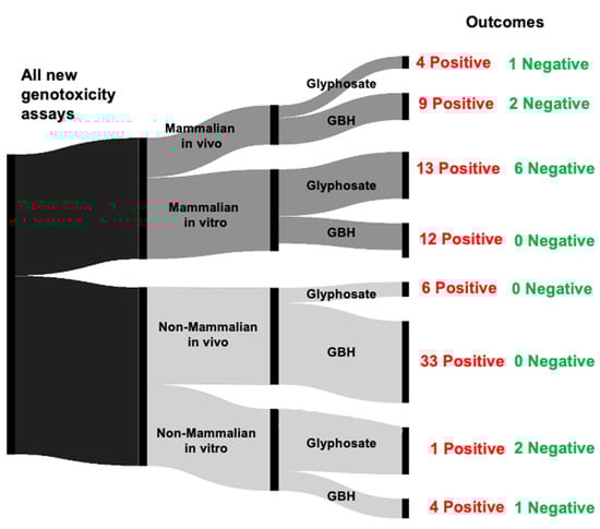 We identified 80 studies published since 1/1/2016 reporting the results of genotoxicity assays on technical glyphosate or GBHs [,,,,,,,,,,,,,,,,,,,,,,,,,,,,,,,,,,,,,,,,,,,,,,,,,,,,,,,,,,,,,,,,,,,,,,,,,,,,,,,]. Several studies reported results on both. For these studies, two results are recorded in Supplemental Tables S1–S5, one for glyphosate and one for GBHs. There are a total of 94 assay results on glyphosate and GBHs included in the master table. A few studies also report results for AMPA, glyphosate’s primary metabolite. A positive genotoxicity response in an assay testing AMPA is considered evidence of a positive response to a GBH/glyphosate.