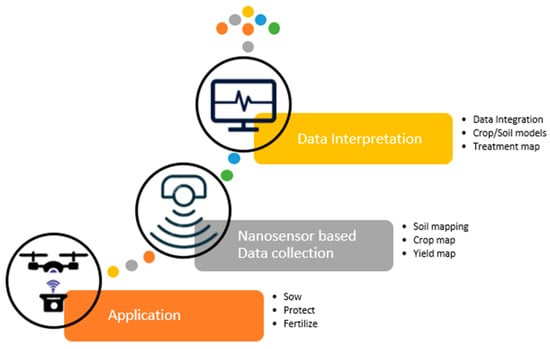 Precision agriculture (PA) is an approach to farming that utilizes advanced technologies that leverage cutting-edge technology and data-driven decision-making tools to increase crop yields and optimize resource management (Figure 1). It aims to reduce waste, improve efficiency, and increase profitability. On the other hand, nanotechnology is a field of science and technology that deals with materials and structures on a nanoscale level. Nanotechnology can revolutionize the field of precision agriculture, offering farmers and growers new tools and techniques for enhancing crop production. Although nanotechnology and precision agriculture differ in their focus, they share some interrelated aspects. Nanotechnology can create new materials and tools that can strengthen precision agriculture practices. For example, nanosensors can monitor soil and plant health in real-time, allowing for more accurate and efficient crop management. NPs can also improve the delivery of nutrients and pesticides to plants, reducing waste and increasing effectiveness.