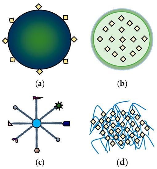 Representation of various nanomaterials for pesticide and fertilizer delivery: (a) adsorption on the nanoparticle; (b) encapsulation in the nanoparticulate polymeric shell; (c) attachment to the nanoparticle mediated by different ligands. The central circle represents the core, and the arms ending denote ligands; (d) entrapment in polymeric NPs.