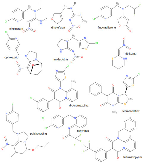 Other NNs, approved all over the world, are exhibited in Table 2. Although those are known by some pesticide databases, only a few are carried by European firms like fenmezoditiaz. Some were approved by USEPA (i.e., nithiazine, nitenpyram, dinotefuran), while some are largely unknown in Europe. None of them are pending in the EU nor were evaluated or submitted by EU PPP regulations to the EFSA (European Food Safety Authority). These molecules are de facto more elaborate and complicated than the first of the NN family, even if the usual functional groups are found.