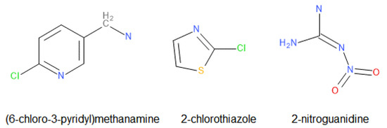 This first block of molecules in Figure 2, which are quite similar (some in particular, such as thiamethoxam, which is an intermediate in the synthesis of clothianidin), take up motifs from other molecules, called chemical moieties or functional groups. All EU NNs are planar molecules, except sulfoxaflor, which is chiral, sold as a mixture of two racemic diastereomers.