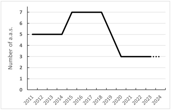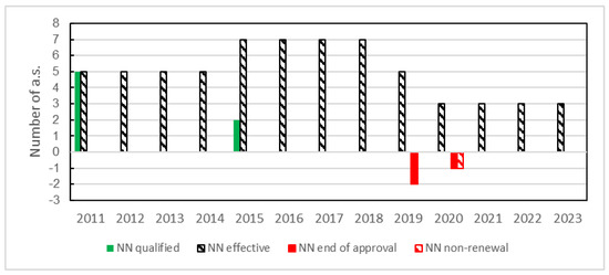 Figure 5 exhibits only a few variations, and the linear regression shows an unconvincing coefficient. Nevertheless, in percentage terms for NN a.s., the drop is significant (+40% during the first period 2011–2019, and then −57% between 2019 and now). Following, the inputs and outputs of the different NN a.s. with their respective legislative acts are detailed in Figure 6.