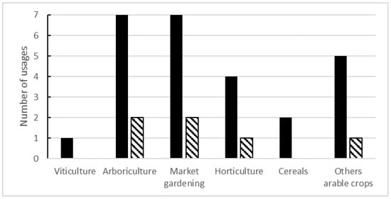 All crop classes [2] were covered by NN insecticides, although only a few active substances were dedicated to viticulture (Figure 8). During the last few years, the disappearance of four NNs considerably decreased these usages, down to none for viticulture and cereal.
