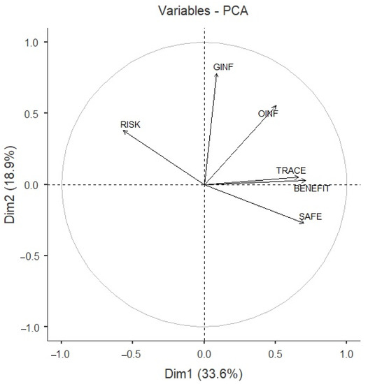 Graph showing the relationship between PCs using principal components analysis: OINF—official information sources; BENEFIT—perceived pesticides’ benefits; GINF—general information sources; TRACE—confidence in traceability; RISK—perceived pesticides’ risk; SAFE—perceived plant-food safety.