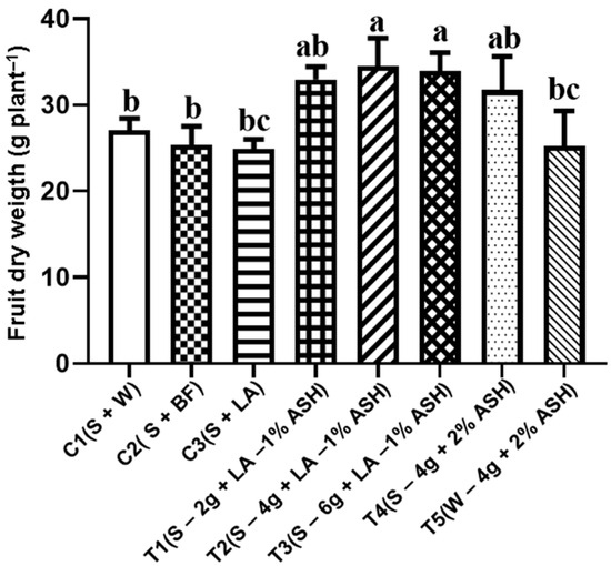 Effect of the experimental treatments on the dry weight of harvested cherry-tomato fruits. The bar above each column indicates the standard error. Different superscript letters indicate statistically significant differences between group means under each condition.