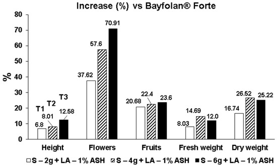 Percentage of increase in the agronomic variables due to the combination of 1% ASH plus 2, 4, or 6 g of MSP (T1–T3) compared to the effect of the foliar Bayfolan® Forte (C2).