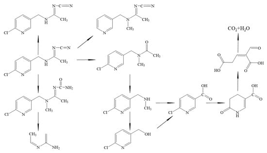 As research progresses, the pathways of acetamiprid biodegradation are better understood (Figure 2). Generally, the C≡N of acetamiprid is produced through the oxidation breakdown of N-amide derivatives, which are dissolved asymmetrically to produce two intermediates, with one intermediate rapidly producing 6-chlorophyllic acid and eventually being mineralized to H2O and CO2 []. Rhodococcus sp. BCH-2 can degrade acetamiprid to Ac-4 and rapidly oxidize it to produce 6-chloropyric acid, which is eventually mineralized to CO2 and H2O after multi-stage oxidation []. Furthermore, studies have demonstrated that acetamiprid does not produce an intermediate in some microbial degradation processes, i.e., it is directly dechlorinated and de-methylated to the final product [], and that micro-organisms cannot convert this final product into other products, although studies have found that it can continue to be degraded in animal and plant systems []. During the degradation of acetamiprid, genes like anhA, anhC, anhB, anhD, and anhE play important roles [].