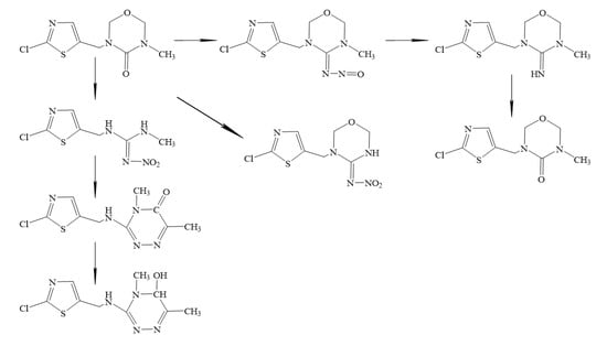 Thiamethoxam can be degraded by microorganisms in a variety of ways, one of which is through the nitro-reduction metabolic pathway to produce nitroso, guanidine, and urea. This pathway is the main pathway for microbial degradation of thiamethoxam. It can also be converted to methyl-thiamethoxam via the demethylation pathway []. (Figure 3). In a recent study, a thiamethoxam degrading functional strain Ensifer adhaerens TMX-23 was isolated via screening from rhizosphere soil bacteria, could biotransform 96% of thiamethoxam in soil samples [], thereby accelerating the degradation of thiamethoxam residues in the soil.