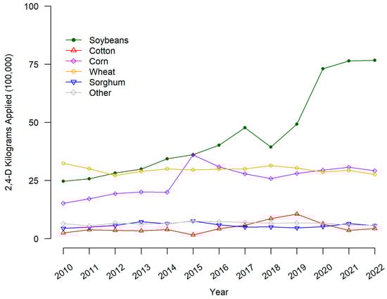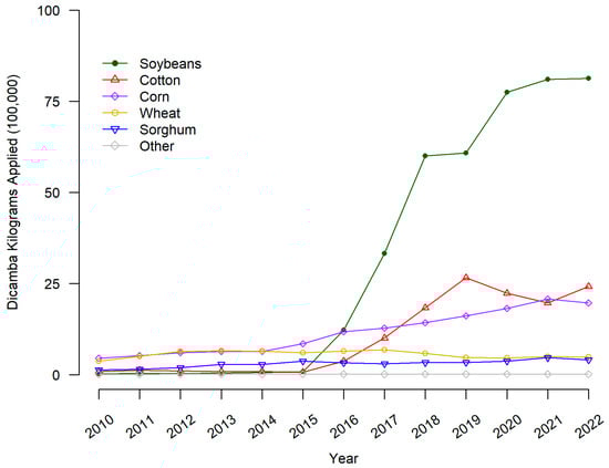 The majority of soybean and cotton seeds sold in the US are now genetically engineered to tolerate combinations of glyphosate, glufosinate, dicamba, 2,4-D (2,4-dichlorophenoxyacetic acid), and the “fop” chemical family of ACCase (acetyl-CoA carboxylase) inhibitor herbicides. As a result, reliance on dicamba and 2,4-D has risen 10-fold or more compared to 2010 []. To further demonstrate the increase in dicamba and 2,4-D, we present the estimated kilograms (in 100,000 s) of dicamba applied each year to surveyed US cropland for the years 2010 to 2022 obtained from the Pesticide Use Data System (PUDS) []. The system utilizes data issued by the USDA’s National Agricultural Statistics Service via QuickStats []. Values for years lacking NASS survey results are interpolated using the methodology developed by the Economic Research Service to produce a continuous temporal dataset from periodic survey results. Of note, the year 2022 is a forecasted level. From Figure 1, the overall level of dicamba use (kilograms applied in one hundred thousands) in the US has increased for soybeans since 2015 and slightly increased for cotton and corn. Levels do not indicate an increase in wheat, sorghum, or other crops.