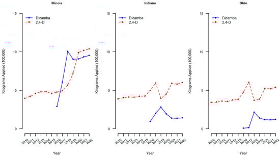 Similar figures of kilograms applied of dicamba and 2,4-D in 100,000 s of kgs to soybean crops are reported for the three midwestern states of the region where participants of the current study were enrolled (Illinois, Indiana, and Ohio).