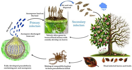 The disease cycle consists of two phases: the sexual or primary phase occurring mainly in winter, and the asexual or secondary phase which takes place during the vegetative period in spring/summer (Figure 1) [6,13].