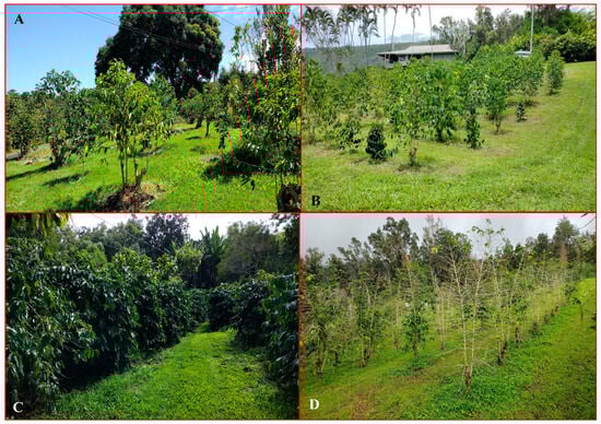 Coffee farms located in South Kona district of Hawaii Island, Hawaii, USA: farm 1, located in Captain Cook (A), farm 2, located in Honaunau (B), and farm 3, located in Milolli (C) villages, respectively. Coffee trees at the end of harvesting season (December) with high defoliation caused by CLR infection (D).