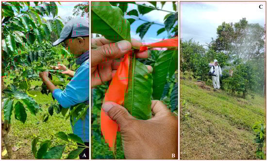 Monitoring CLR infection with the participation of coffee growers (A), and detecting the initial infection and sporulation of CLR on a coffee leaf (B). Spraying a fungicide using a backpack mist blower sprayer and wearing all personal protection equipment (PPE) (C).