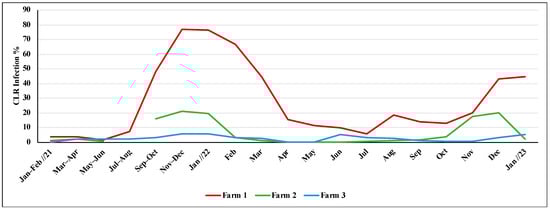 During both coffee seasons, the pattern of CLR incidence was similar at all three farms: low during the first semester (flowering and berry development) and high during the second semester (fruit maturation and harvest). However, CLR incidence levels were different among farms reaching 77%, 22% and 6% at the end of 2021 and 43%, 20% and 3% at the end of 2022 at farms 1, 2 and 3, respectively. Higher CLR incidence was observed at farm 1, which showed significant differences in comparison with farms 2 and 3. High CLR incidence occurred during the harvest season. This may be due to the physiological response of the coffee plants, which were focused on fruit filling rather than supporting the defense system against the pathogen [,,,]. In addition, years with high intensity of flowering and fruit production have been associated with high levels of CLR infection [,,,]. In Kona coffee farms, production was 17% higher during the 2021 coffee season in comparison with 2020 []. Other aspects such as weather conditions (temperature, rainfall, humidity, solar radiation), age of trees (20–100 years), planting density (1600–2250 trees per ha) and the type and method of fungicide spray application may all play relevant roles in CLR infection and the effectiveness of the fungicides applied. At farm 1 the combination of older trees (100 years old), shade from associated trees (avocado, citrus, macadamia nut, palms and banana), high rainfall and humidity, lower solar radiation and ineffective sprays of fungicides, all could have contributed to the high increase in CLR at the end of the harvest season.