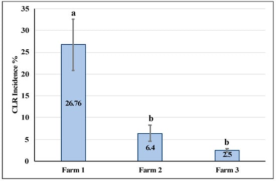 The CLR incidence (mean ± SEM) for each coffee farm during both coffee seasons surveyed (2021 and 2022) is shown in Figure 4. In coffee farms 2 and 3, the CLR incidence on average was significantly lower in comparison with farm 1.