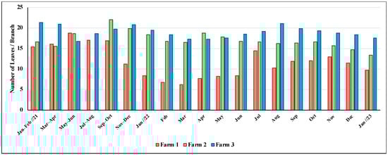 At the beginning of the CLR survey (January 2021), the average number of coffee leaves per branch was similar at coffee farms 1 and 2, while it was higher at farm 3 (Figure 5). Over the course of two years, the number of coffee leaves per branch was relatively stable at all three farms until the end of harvest season (December–January), in which a high reduction of leaves was observed at farm 1 (Figure 5). In contrast, at coffee farms 2 and 3, a slight reduction in the number of coffee leaves per branch was observed.