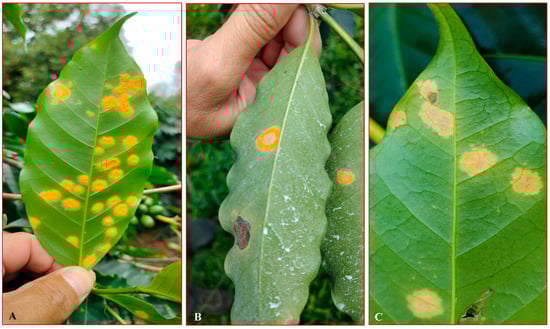 Coffee leaf showing CLR infection with active sporulation before sprays of fungicides (A). Infected coffee leaf ten days after a copper-based fungicide was applied. Notice a halo around the infected spot, which is the appearance of spores after the spray (B). Infected coffee leaf showing dry spots without active sporulation, which is the effect of a translaminar fungicide applied ten days previously (C).