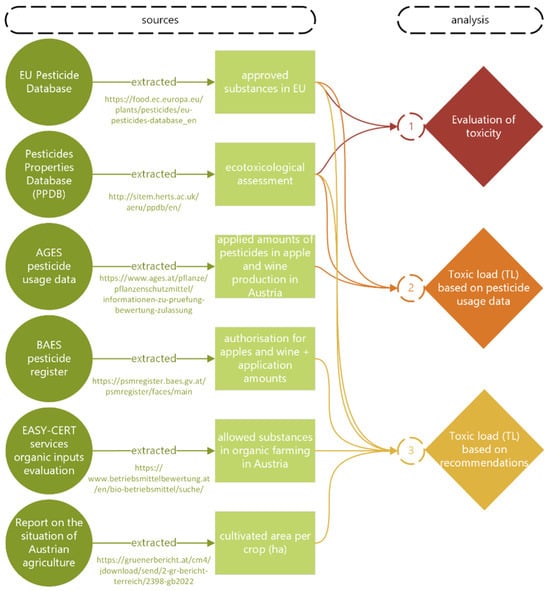 Firstly, we collected data on the area under apples and grapevines in Austria (Table 1). Secondly, the ASs approved in Austrian apple and grapevine production were taken from the publicly accessible Austrian plant protection product register of the Austrian Authority for Food Safety (https://psmregister.baes.gv.at; accessed on 22 February 2023). Thirdly, the dosages applied in conventional or organic apple and grapevine production were gathered from the Austrian Federal Agency of Health and Food Safety [33]. The most recent report is from 2017 and contains data on pesticide use in the field from 940 Austrian farms growing 16 different crops on a total area of 28,200 ha; however, it was not specified how many apple and grapevine farms were included in the dataset. Furthermore, most of the documented crops only consider conventional cultivation; a distinction between conventional and organic production was only available for apple and grapevine production [33]. Unfortunately, however, these data on pesticide use do not indicate the amounts of specific ASs, but only for groups of ASs, e.g., for fungicides only, the groups carbamates and dithiocarbamates, imidazole and trizoles, other organic fungicides, and inorganic fungicides (Table 1). Information on which of the approved ASs belong to which pesticide group for conventional and organic apple and grapevine productions was collected from information in VO 1185/2009 from the European Commission [34].