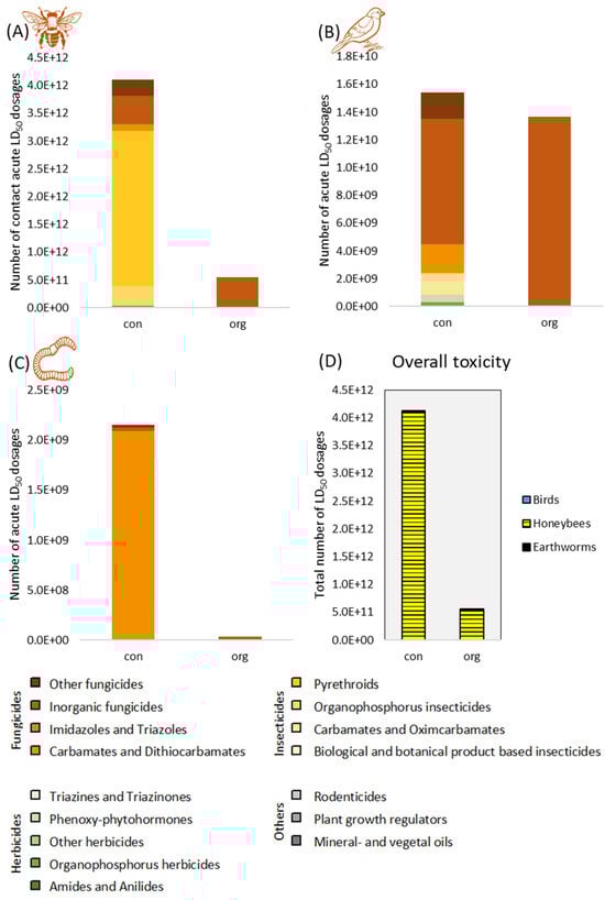 Potential number of LD50 doses of pesticides applied in conventional (con) and organic (org) vineyards in Austria annually for honeybees (A. mellifera) based on contact acute LD50 in µg bee−1 (A), for birds (S. serinus) based on acute LD50 in mg bird−1 (B), and for earthworms (E. fetida) based on acute LD50 in mg worm−1 (C), and total number of LD50 doses for honeybees, birds, and earthworms (D).