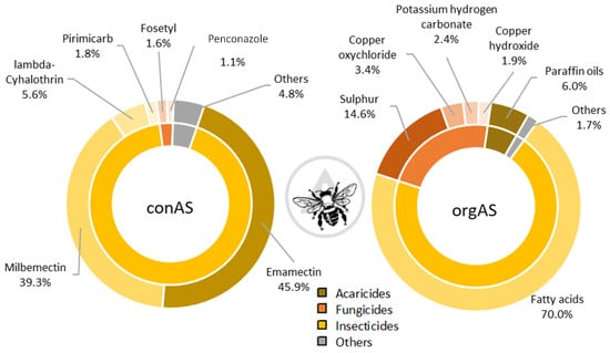 The ASs used in Austrian apple production in 2017 contributed to a potential toxic load (TL) to honeybees of 4.1 × 1012 LD50 doses in conventional apple production versus 0.55 × 1012 LD50 in organic apple production (Figure 3A).